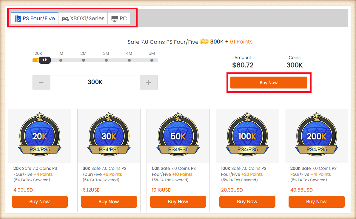 2. Wähle deine Konsole, gib den gewünschten Münzbetrag ein oder wähle ihn aus und klicke auf "JETZT KAUFEN".